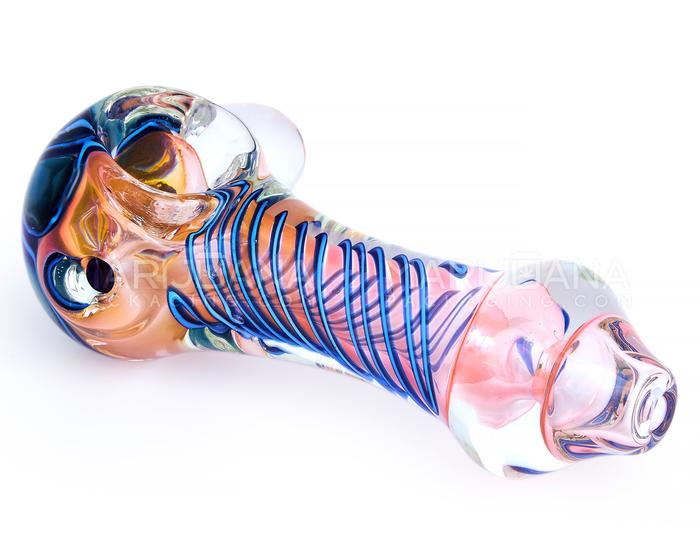 These 4.5” Assorted Double Blown Fumed Knocker Hand Pipes practically glow with gilded fuming. Vibrant colors of swirl ribbons wrap around the stem to add character to the heavy glass spoon pipe design. At 4.5”, it’s the perfect size for an inconspicuous smoking piece. Each of these glass pipes is crafted from high grade, heat resistant glass.